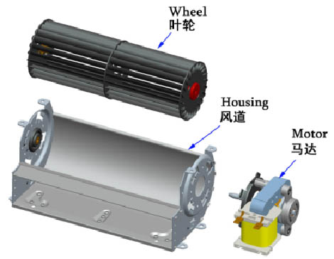 貫流風(fēng)機(jī)主要由葉輪,風(fēng)道和電動機(jī)三部分組成,葉輪材料一般為鋁合金或工程塑料。鋁合金葉輪強(qiáng)度高,重量輕,耐高溫,能夠保持長久平穩(wěn)運(yùn)轉(zhuǎn)而不變形;塑料葉輪由模具注塑,再由超聲波焊接而成,一般用于轉(zhuǎn)速較低的場合,直徑較大。